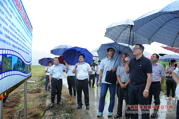 陳剛副主席(右三)在岜獨(dú)村村委前,詳細(xì)了解岜獨(dú)村村莊規(guī)劃及建設(shè)有關(guān)情況,住建廳副廳長汪夏明(右一)陪同調(diào)研