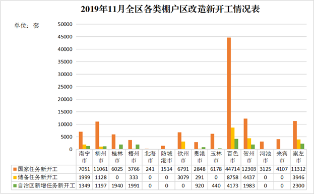 2019年11月全區(qū)各類棚戶區(qū)改造新開工情況如下圖所示: