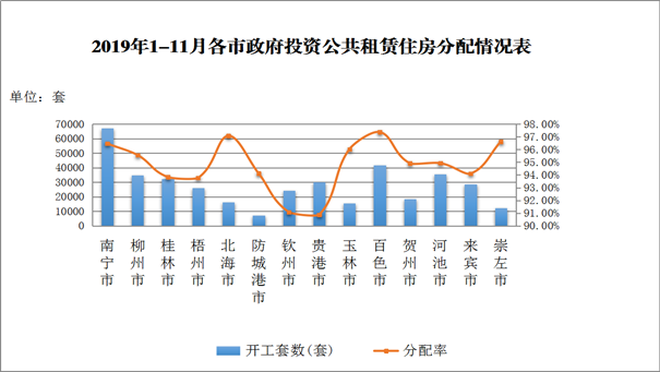 全區(qū)1-11月各市政府投資公共租賃住房分配情況如下圖所示: