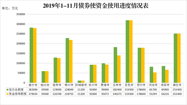 目前,柳州市、防城港市、欽州市、百色市、賀州市和崇左市兩期債券資金均已完成使用。部分城市兩期債券資金平均使用進度較慢,其中使用率低于全區(qū)水平(94.47%)的設(shè)區(qū)市有玉林市(76.90%)、河池市(65.23%)和來賓市(77.08%)。第一期債券資金中,玉林市(93.06%)、貴港市(84.14%)和來賓市(78.23%)尚未完成使用;第二期債券資金中,南寧市(98.87%)、桂林市(98.02%)、梧州市(92.78%)、玉林市(67.88%)、貴港市(95.51%)、河池市(45.58%)和來賓市(76.56%)暫未完成使用。