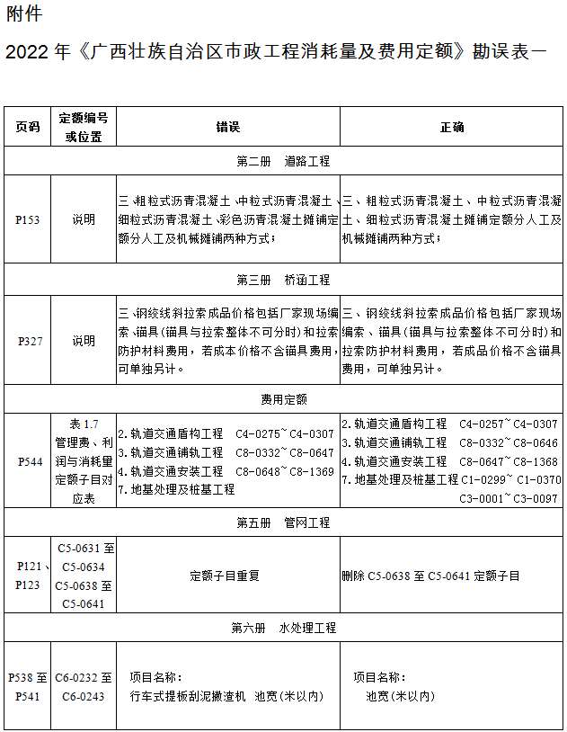 附件:2022年《廣西壯族自治區(qū)市政工程消耗量及費(fèi)用定額》勘誤表(一)