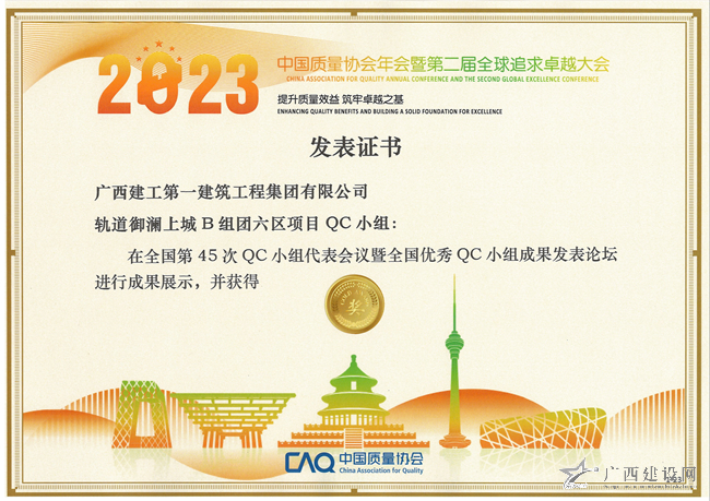 據(jù)悉,中國質(zhì)量協(xié)會年會暨第二屆全球追求卓越大會以“提升質(zhì)量效益,筑牢卓越之基”為主題,聚焦新時代質(zhì)量效益提升的相關(guān)話題,同期舉辦的全國第45次QC小組代表會議暨全國優(yōu)秀QC小組成果發(fā)表論壇在質(zhì)量管理領(lǐng)域規(guī)模大、涉及面廣、凝聚力強(qiáng),是國內(nèi)質(zhì)量管理領(lǐng)域的最高殿堂。廣西建工一建集團(tuán)是廣西建筑行業(yè)唯一被推薦參與此次盛會并進(jìn)行成果發(fā)布的建筑施工企業(yè),體現(xiàn)了該公司在全面質(zhì)量管理方面的努力和成效。廣西建工一建集團(tuán)將以此為契機(jī),進(jìn)一步加強(qiáng)QC小組建設(shè),大力弘揚(yáng)工匠精神,解決項(xiàng)目施工過程中的重點(diǎn)、難點(diǎn)、痛點(diǎn)問題,持續(xù)推進(jìn)質(zhì)量管理工作,為推動集團(tuán)公司高質(zhì)量發(fā)展和建設(shè)質(zhì)量強(qiáng)國貢獻(xiàn)力量。(一建集團(tuán) 李福昆)