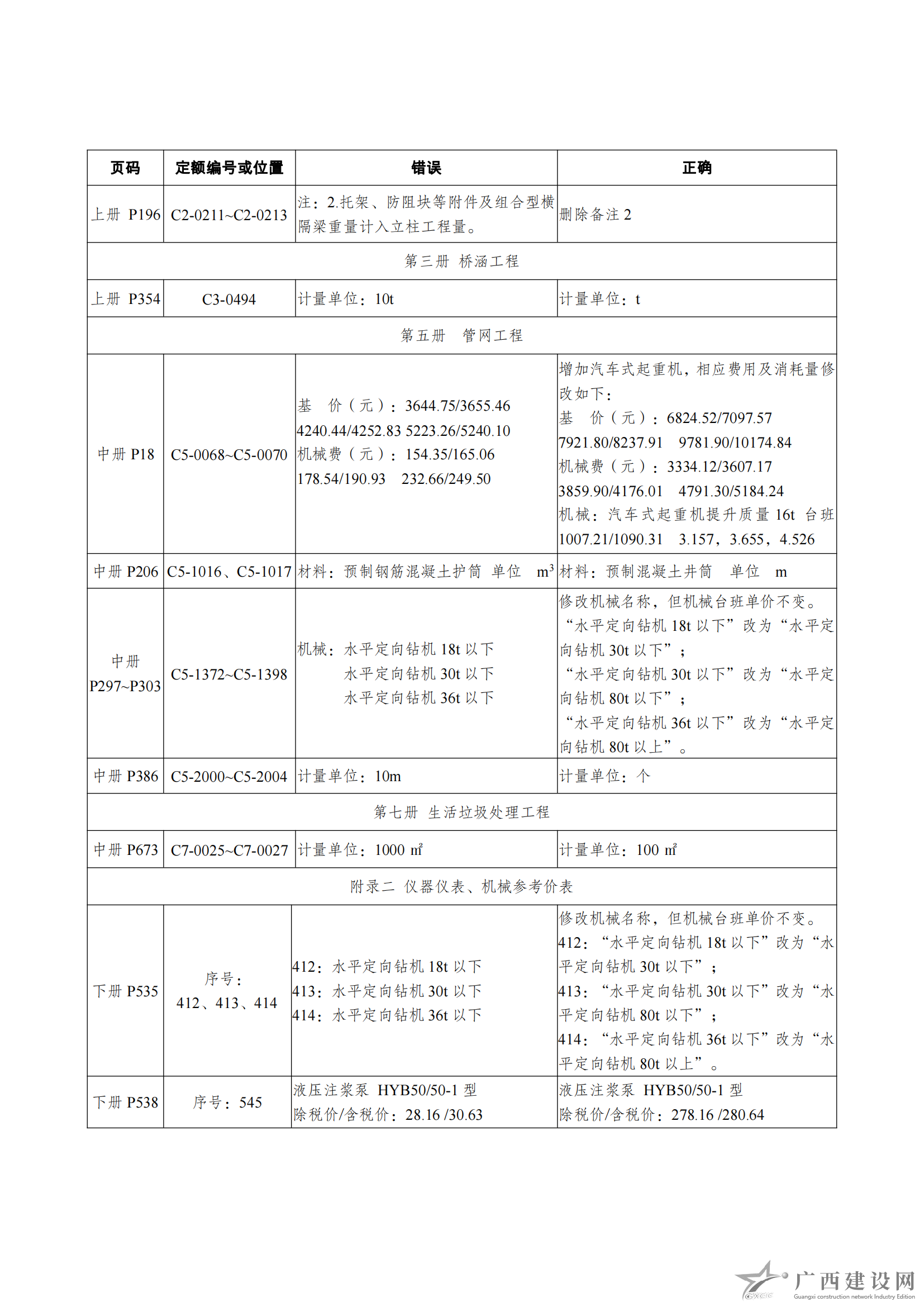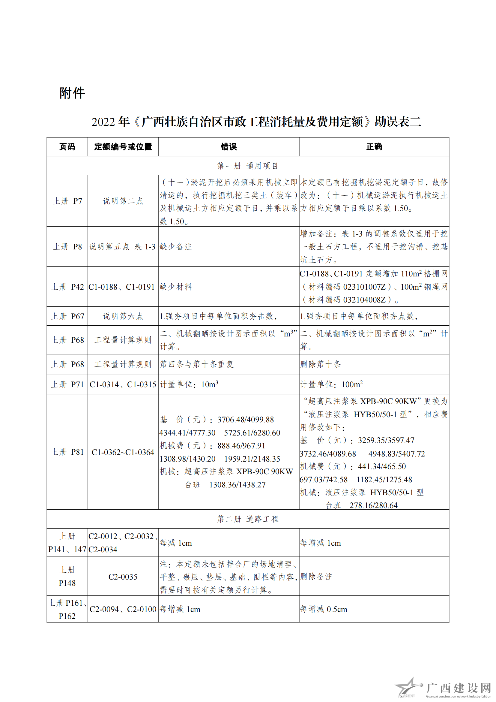 附件:2022年《廣西壯族自治區(qū)市政工程消耗量及費用定額》勘誤表(二)