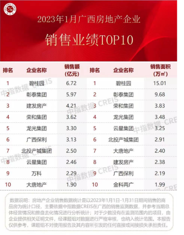 而據(jù)中指研究院統(tǒng)計數(shù)據(jù)顯示,廣西房地產(chǎn)企業(yè)今年1月份的銷售業(yè)績榜單前十成員,成交數(shù)據(jù)普遍好于去年同期,成交金額最低也有1.9億元,最高為排名榜首的碧桂園,總銷售額達(dá)到6.72億元,迎來了兔年樓市“開門紅”。