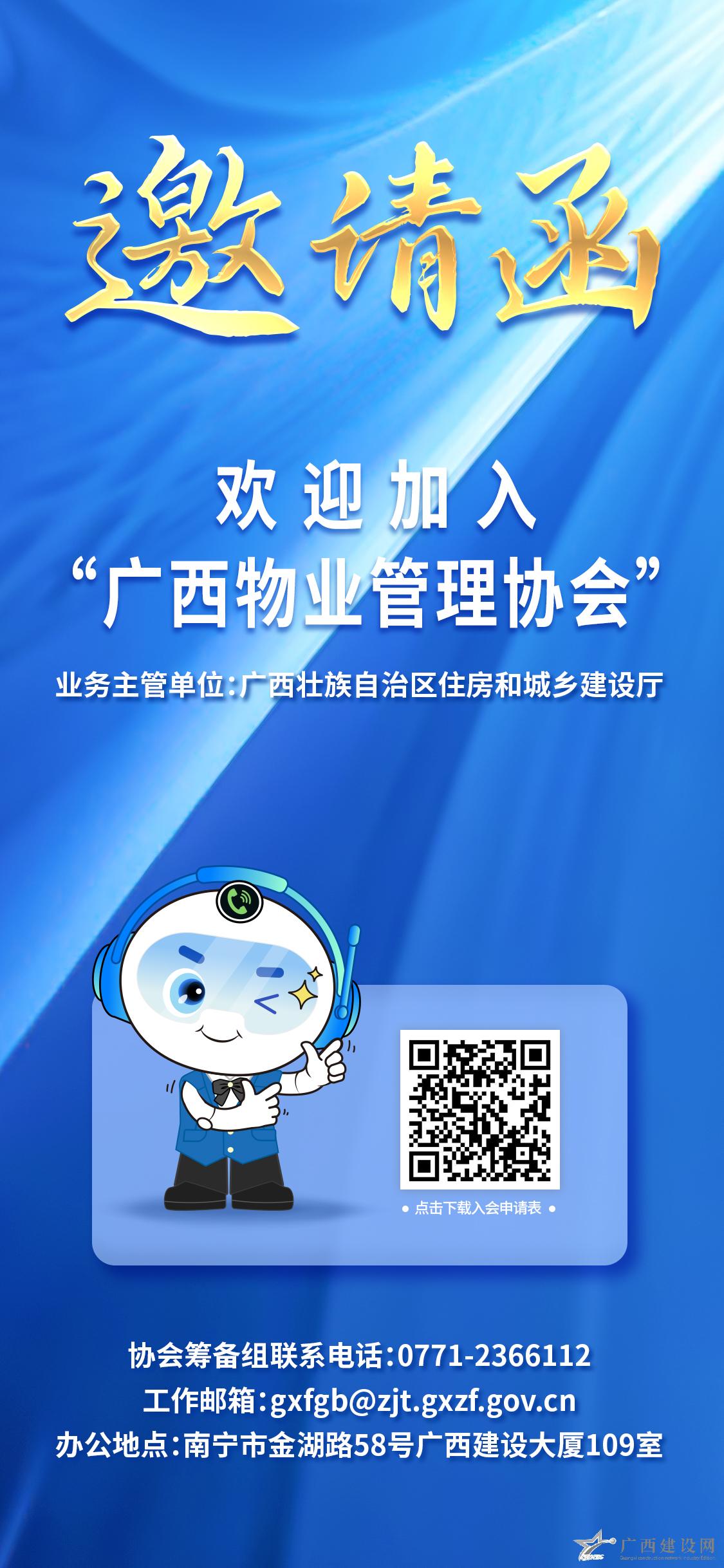 為推動物業(yè)行業(yè)高質(zhì)量發(fā)展,提升廣西物業(yè)管理基層社會治理能力及綜合服務(wù)水平,現(xiàn)面向全區(qū)誠摯邀請有遠見、有擔(dān)當?shù)奈飿I(yè)服務(wù)企業(yè)及相關(guān)行業(yè)企業(yè)加入廣西物業(yè)管理協(xié)會,請有意向的企業(yè)掃碼下載并填寫《廣西物業(yè)管理協(xié)會單位會員入會申請表》發(fā)送至以下工作郵箱。