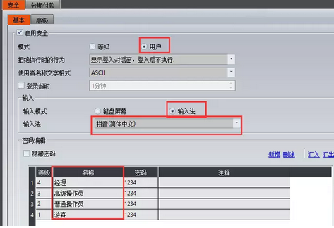 安全里面有兩種模式:第一種是等級模式對于賬戶信息,您只可以修改密碼;第二種是用戶模式,處理等級密碼之外,您還可以設(shè)定用戶名。如下圖: